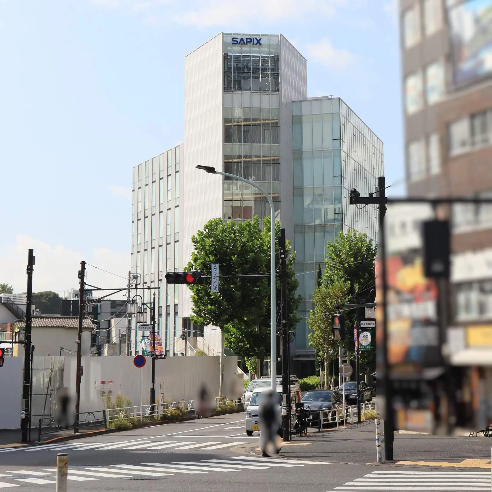 交差点の正面奥、「SAPIX」の看板のあるビルが日本入試センターの本社ビルです。